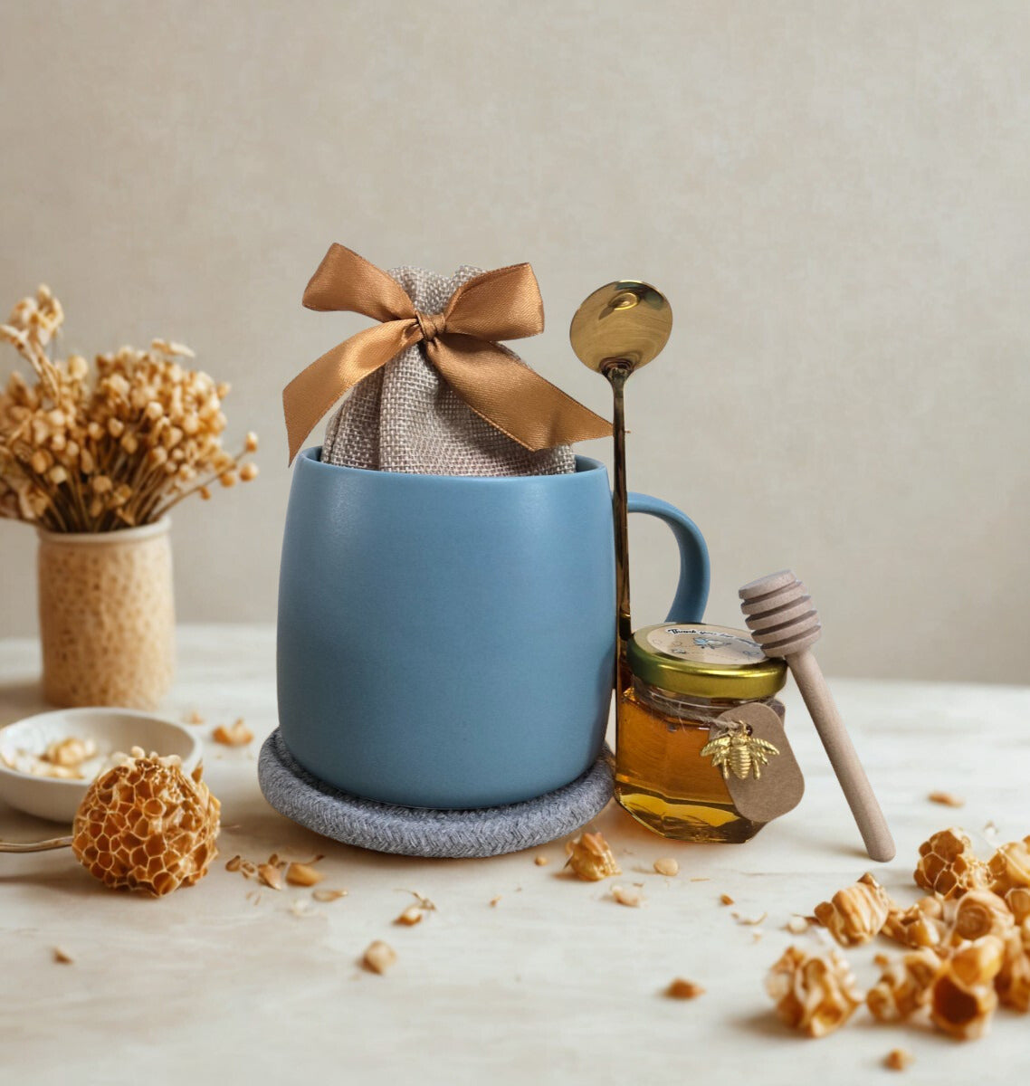 Ceramic mug or insulated tumbler, organic teas, and a mini honey jar with dipper for a comforting pause.